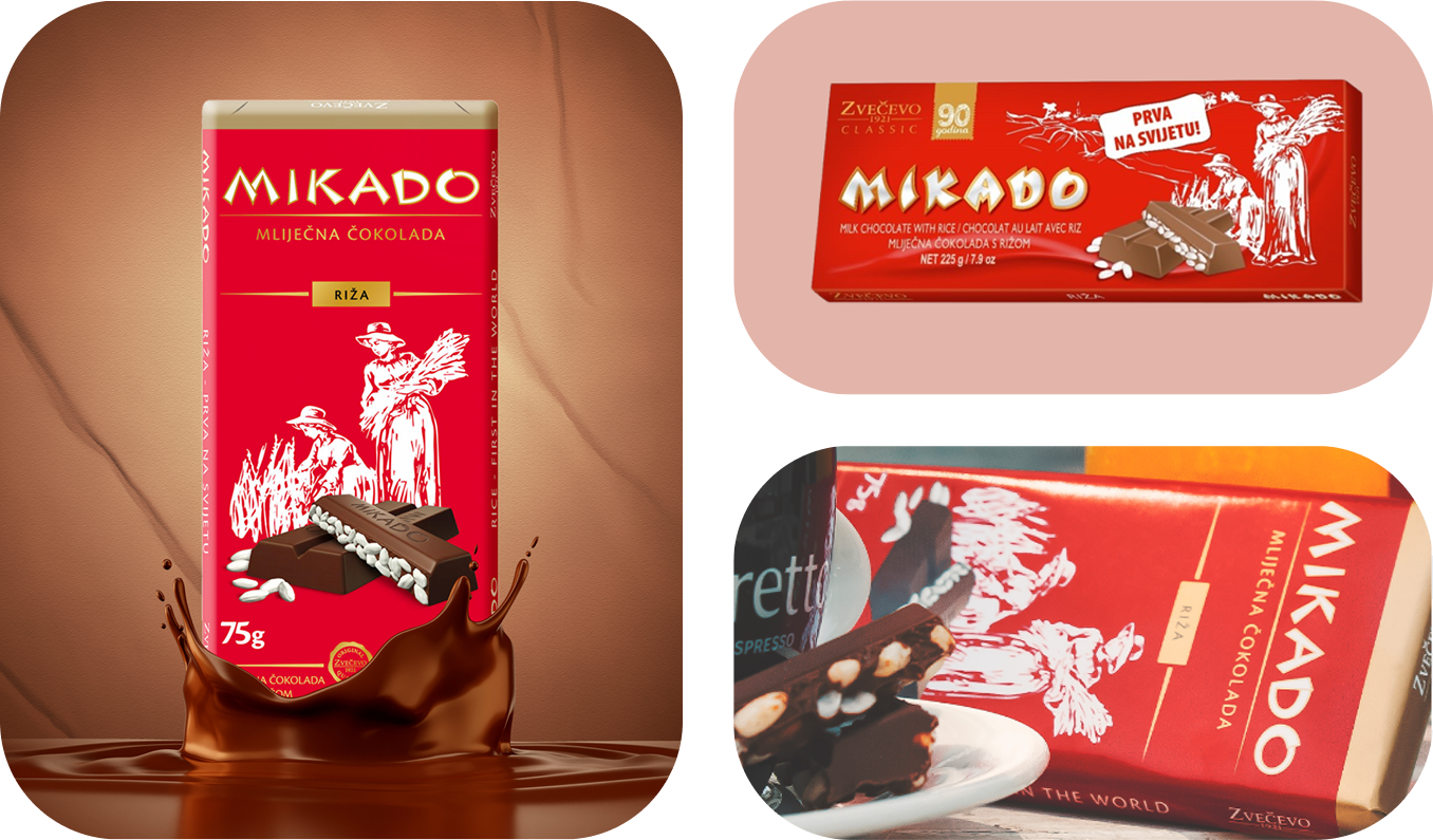 Krovni brend Zvečeva je MIKADO. Svaka Mikado čokolada s rižom nosi vaše ime u sebi, dobri je duh vašeg djetinjstva i djetinjstva vaše djece, dio je vašeg svakodnevnog života, član je vaše obitelji i još uvijek je najbolja!